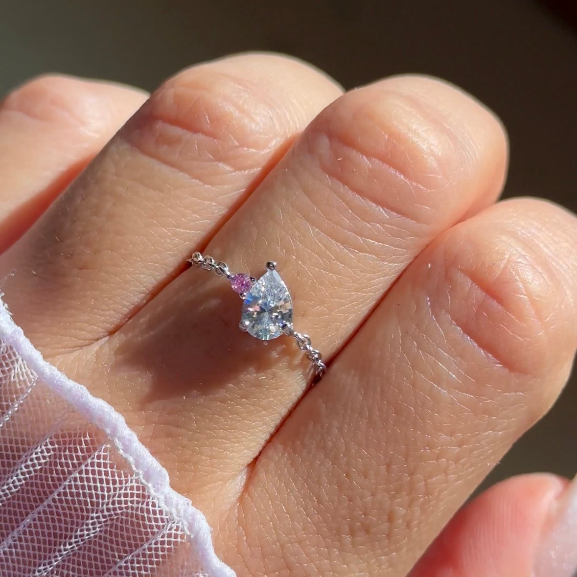 Our Mommy & Me Chain Ring is designed to celebrate the unbreakable bond between mother and child. Featuring a drop-shaped diamond to represent mom and a delicate baby round diamond hugging on the side. This ring captures the love, strength, and joy of motherhood in a timeless design.
