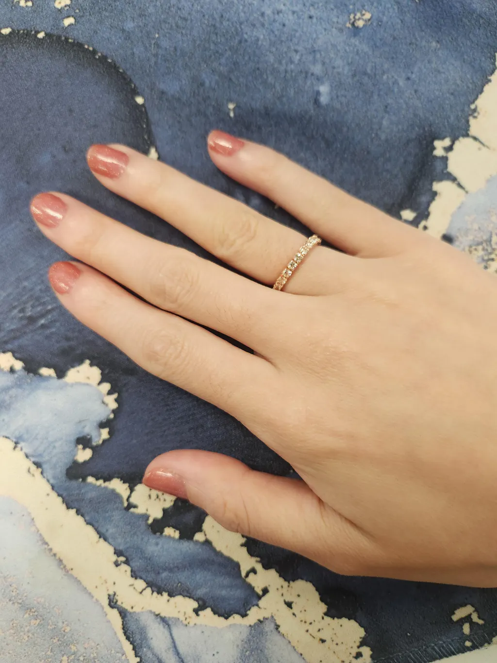 The eternity ring is just as stunning in person as it was on the pictures! I’ve added it to my marriage stack to keep my rings in place and it matches so perfectly. It looks and feels so high quality, like I should’ve spent way more than I did. I wondered about the ball and dangling chain, but they have not bothered me I the least. I love the adjustability of this ring and I’m so happy with this purchase.