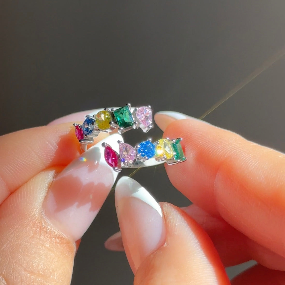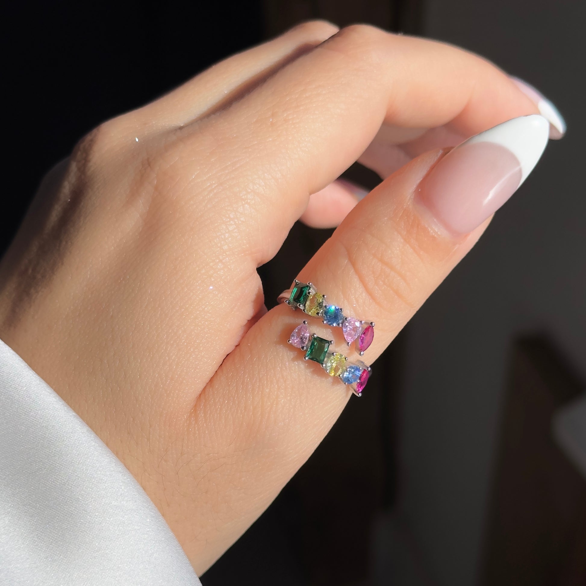 Add a burst of color and versatility to your ring collection with our new Open Front Adjustable Ring. This ring showcases a stunning arrangement of vibrant, rainbow-colored stones delicately set on either side of the open-front band. Each stone shimmers with its unique brilliance, creating a lively spectrum that catches the light from every angle.