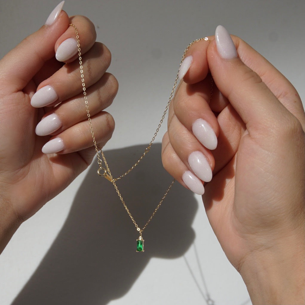 Add the perfect touch of color to your everyday style with this exquisite green emerald necklace. The gold chain sparkles in the light and the green emerald gives the most perfect glow to your skin. The best part, you never have to take it off!